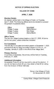 NOTICE OF SPRING ELECTION Village of Cobb April 1st, 2025 Election…